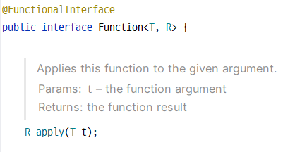Function<T, R> 는 하나의 추상 메소드인 R apply(T t)를 가집니다.