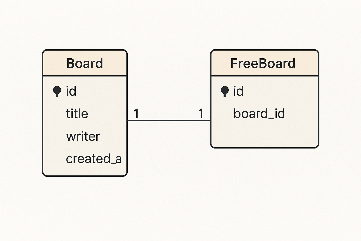 공통요소가 있는 테이블과 게시판 종류별 테이블과의 1:1 관계를 맺는것으로 결론지었다.