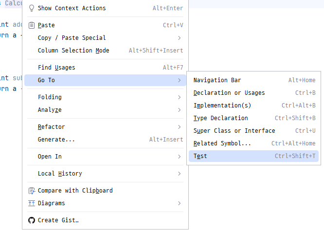 작성이 완료된 클래스 Calculator 에 대하여 우클릭 > Go To > Test 를 누른다.
