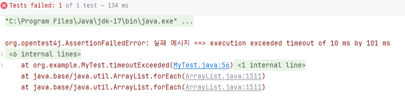 timeoutExceeded() 테스트 메소드를 실행하면 아래와 같은 fail이 발생한다.