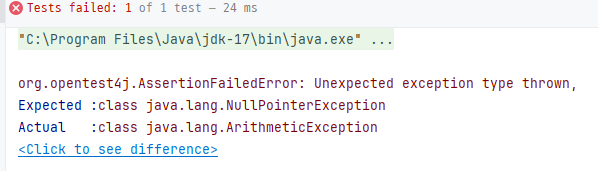 Exception exception = assertThrows(NullPointerException.class, ()->calculator.divide(1, 0));