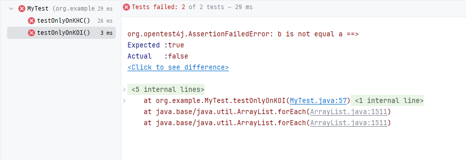 // assertTrue(a==b, "a != b"); << 이 주석을 해제하게 된다면 assumeTrue까지 닿지 않게 된다.