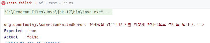 assert~()에서 마지막 파라미터로 실패했을 경우의 메시지 문자열 혹은 람다식이 오게된다.