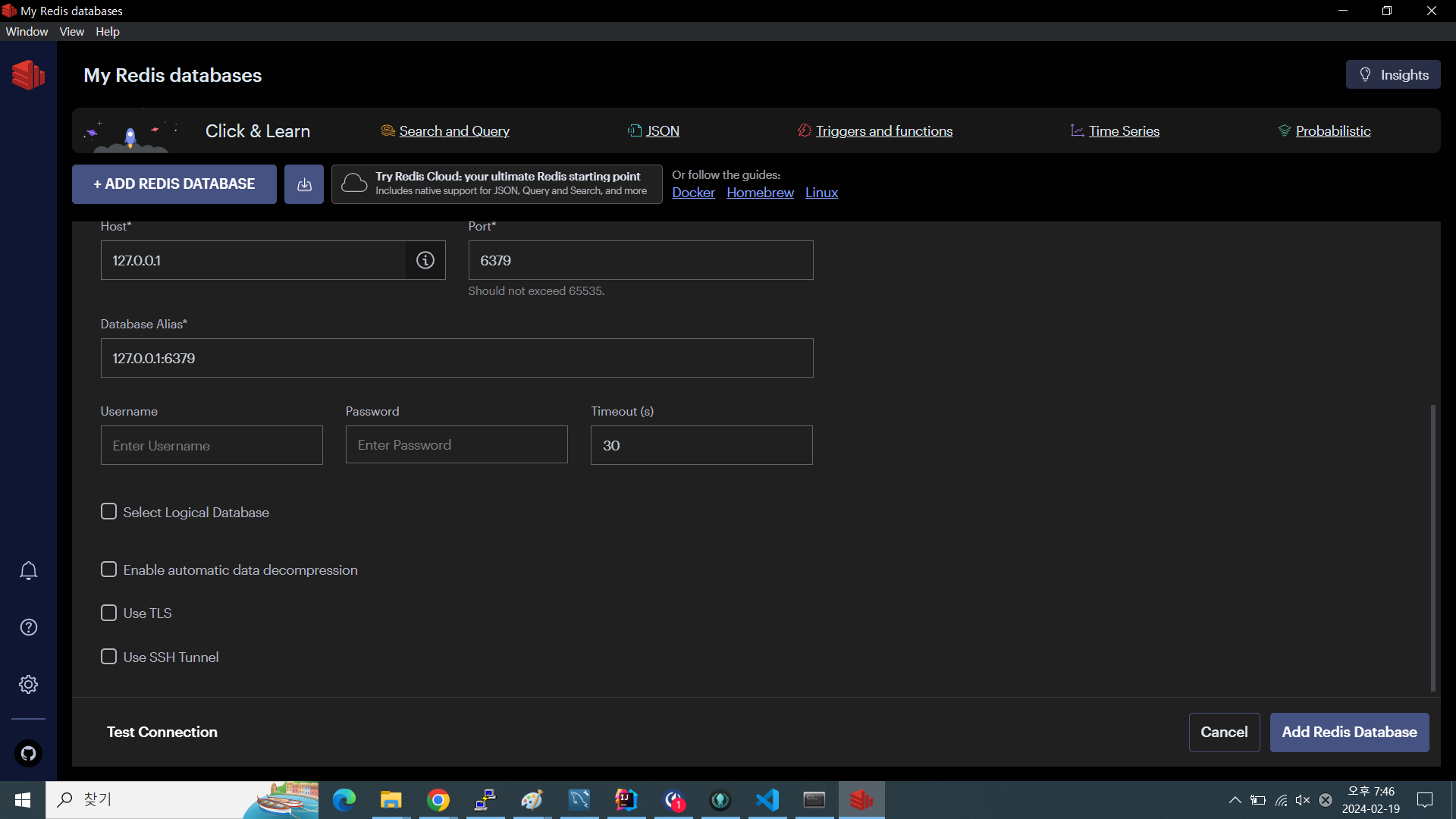 Database Alias 는 이 Redis insight에서 사용할 별칭을 정해두는 것이며